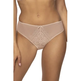 Krajková tanga v béžové barvě. Krajka s květinovým motivem, síťovaná vsadka na přední straně, pas zdobí saténová mašlička. Bavlněný klín.
