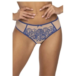 Svůdná tanga Frances v tmavě modré a béžové barvě. Jsou vyrobena z krásné krajky a elastického tylu. Pas zdobí mašlička. Bavlněný klínek.