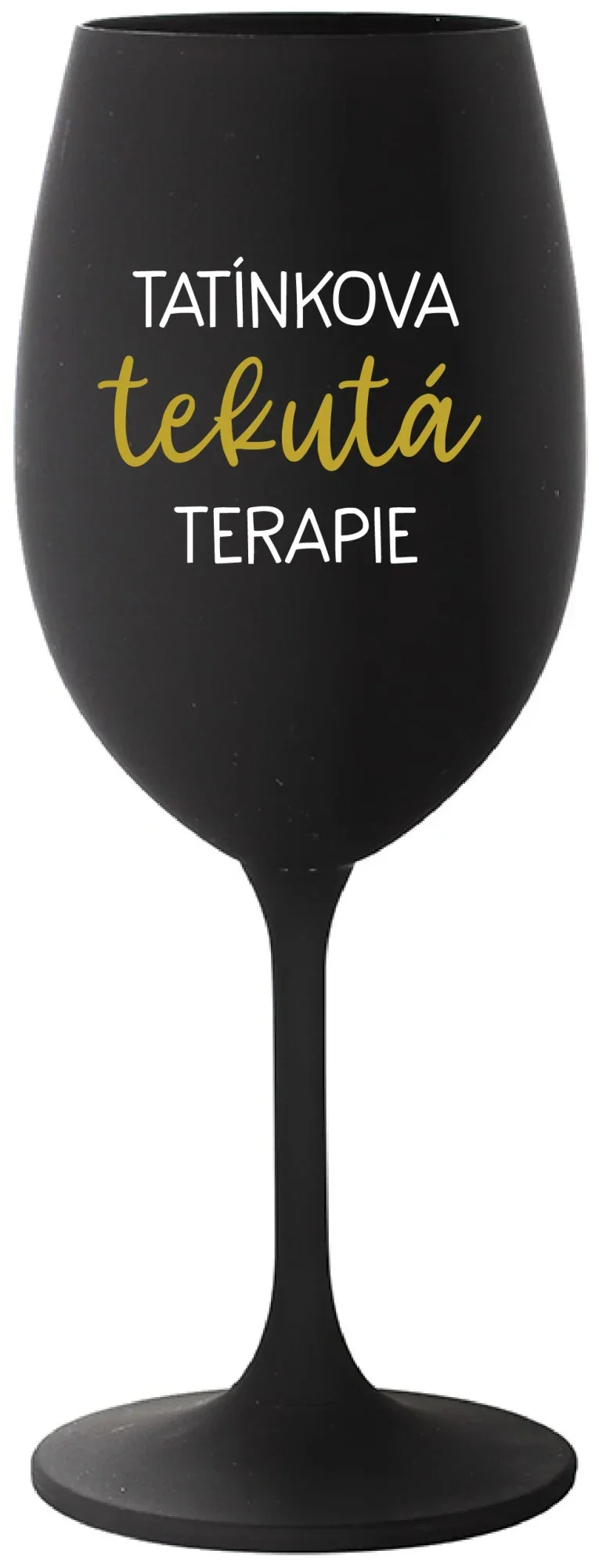 Vinná černá sklenice s originálním motivem TATÍNKOVA TEKUTÁ TERAPIE je krásným a osobitým dárkem, které ale využijete i Vy sami třeba ve chvílích, kdy si budete chtít zpříjemnit náročný den. Tyto originální vinné sklenice jsou totiž nejen pro výjimečné události, ale i pro běžné večery, které si chcete zpříjemnit sklenkou dobrého vína. Jistě proto potěší každého milovníka vína, i toho, kdo si umí svůj život vychutnat plnými doušky.