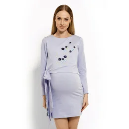 Přiléhavé tunikové šaty. Dvě vrstvy pro diskrétní kojení. Květinové výšivky. Vázaná šerpa na boku. Lze nosit i po těhotenství. Vysoce kvalitní bavlna.
