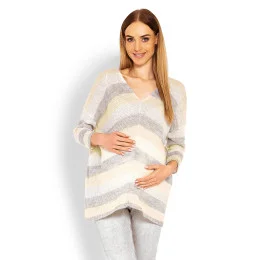 Volný oversize střih. Svetr s tříbarevnými pruhy. Špičatý výstřih. Výstřih do V na zádech.