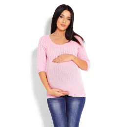 Svetr s jemnou vazbou. Copánky na horní části. Svetr s 3/4 rukávy a kulatým výstřihem.