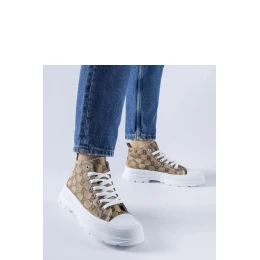 Hnědé tenisky zdobené monogramem Terenzio jsou skvělým návrhem na letní dny. Díky střednímu podpatku jsou pohodlné i při dlouhém nošení. Jejich populární a elegantní střih je ideálním doplňkem mnoha letních outfitů. Vyrobené z gumy poskytují skvělou přilnavost na různých površích. Další výhodou je kulatá špička, která jim dodává jedinečný vzhled. Tenisky mají šněrování, které umožňuje upravit jejich přizpůsobení noze. Ideální na letní procházky a každodenní vycházky. - Materiál: Textil - Výška: Vysoké - Výplň: Ne - Podrážka: Guma - Barva podrážky: Bílá - Zapínání: Na šněrování - Kolekce: Léto