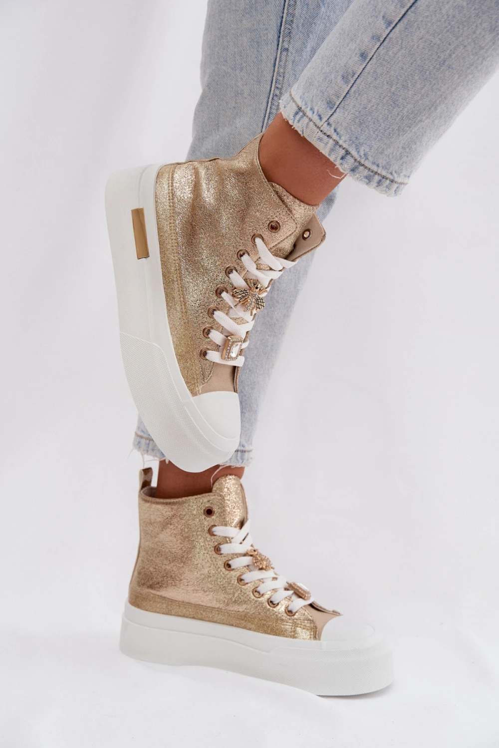Tenisky pro dámy na masivní platformě jsou módní volbou pro milovnice výrazného stylu. Silná podrážka dává obuvi moderní charakter a zajišťuje pohodlné nošení, zlatý prvek pak přitahuje pozornost. Model se šněrováním zaručuje dobré přizpůsobení noze a ozdobné spony dodávají celku originalitu a moderní výraz. Tyto tenisky se skvěle hodí do každodenních outfitů.