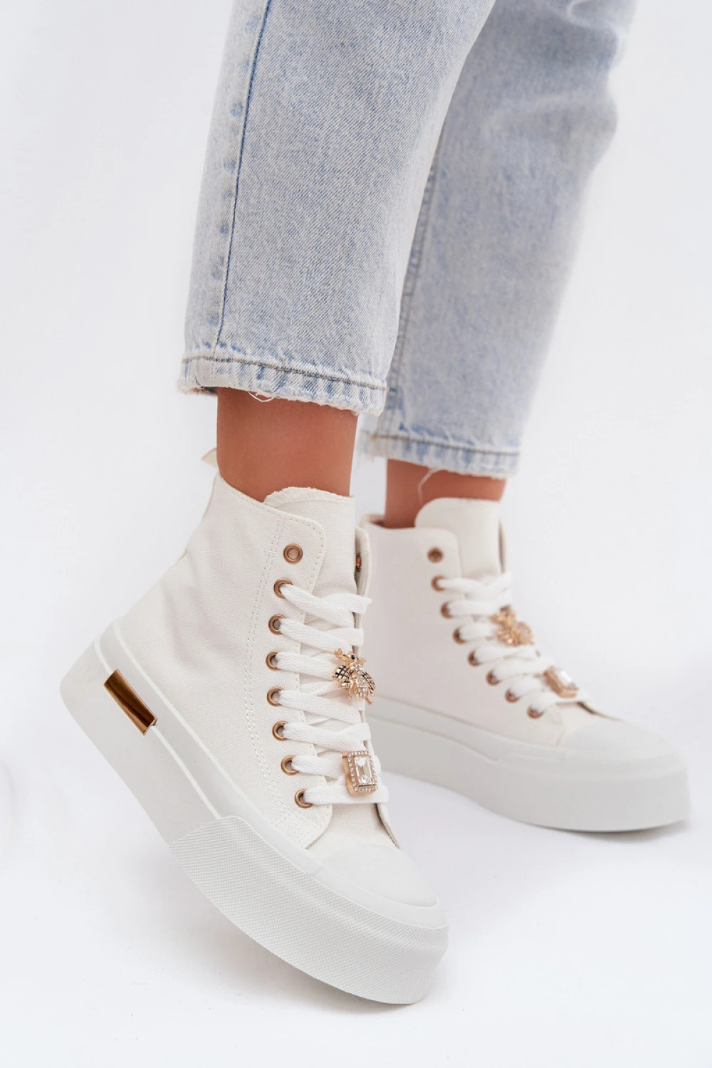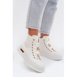 Tenisky pro ženy na masivní platformě jsou módním návrhem pro milovnice výrazného stylu. Silná podrážka dává obuvi moderní charakter a zajišťuje pohodlné nošení, zlatý prvek přitahuje pozornost. Šněrovací model zaručuje dobré přizpůsobení noze a ozdobné přezky dodávají celku originalitu a módní výraz. Tyto tenisky se skvěle hodí do každodenních outfitů.