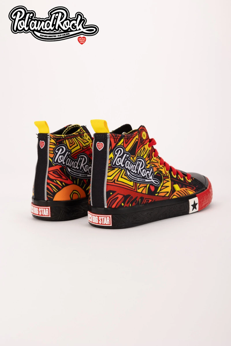 MODEL ROCK Jedinečný vzhled Tento model byl navržen týmem grafiků Jurka Owsiaka a je skutečnou explozí barev a emocí – červená, žlutá a černá tvoří dynamickou kompozici, která okamžitě přitahuje pohled. Na boční části boty se nachází oficiální logo Pol’and’Rock, obklopené grafickými motivy inspirovanými pouličním uměním, hudbou a svobodou. Červené tkaničky a černá podešev zdůrazňují výrazný charakter bot, a celé to doplňuje vysoká kvalita zpracování, pro kterou je značka Big Star Shoes známá. Odolnost a pohodlí Vyrobeny z vysoce kvalitních materiálů, zajišťují pohodlí při nošení po celý den. Pevná gumová podešev zaručuje vynikající přilnavost a ochranu nohy na nerovném terénu, a vysoce kvalitní materiály zajišťují trvanlivost a odolnost proti poškození. Tenisky jsou lehké, pohodlné a ideální na tanec pod scénou, procházky po stanovém poli nebo jednoduše na každodenní nošení s nádechem festivalového stylu. Limitovaná edice Jedinečnost tenisek Big Star Shoes z nich činí skutečný klenot pro sběratele a lidi, kteří sledují nejnovější trendy. Památka Tyto tenisky vám umožní uchovat vzpomínku na 31. ročník festivalu Pol’and’Rock na dlouhou dobu. Festivalová fotografie s vaším partnerem nebo přáteli? Nezapomeňte, že můžete spojit síly a vybrat shodnou obuv pro všechny účastníky. Při výběru velikosti se řiďte tabulkou velikostí.