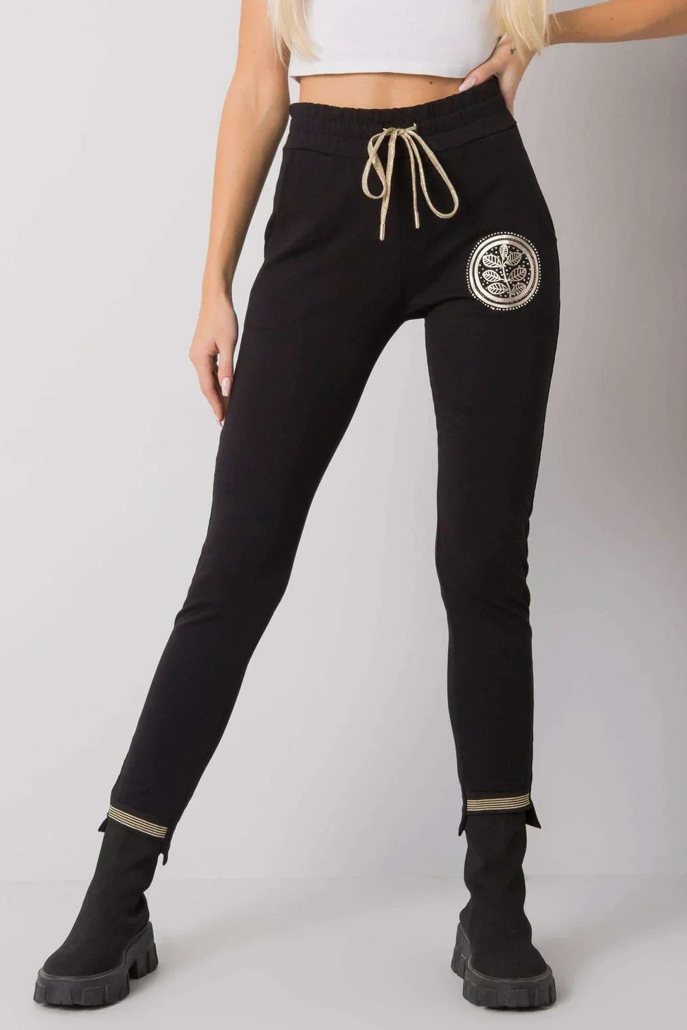 Dámské černé tepláky s potiskem. Pas s gumičkou a stahovací šňůrkou.