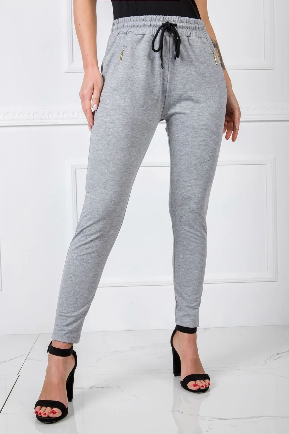 Módní tepláky jsou dnes základem šatníku každé ženy, která má ráda nejnovější trendy v oblékání. Ať už preferujete jakýkoli styl oblékání, jistě si čas od času rádi obléknete pohodlné tepláky. Tento jednoduchý model z naší nejnovější kolekce basic je velmi univerzální a nadčasový, protože ho můžete snadno kombinovat s dalšími kousky oblečení. Má velmi módní střih se štíhlými nohavicemi a vysokým pasem, který zvýrazňuje ženskou postavu a podtrhuje její proporce. Tepláky mají navíc elastický pas a šňůrku, takže si je můžete pohodlně přizpůsobit tvaru své postavy. Model je vyroben z vysoce kvalitního materiálu s vysokým podílem bavlny, který je příjemný na dotek a prodyšný.