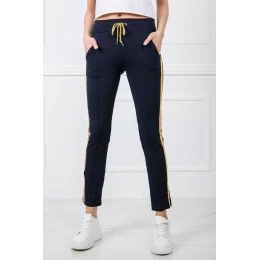 Dámské teplákové kalhoty s elastickým pasem a vázáním. Kalhoty s ozdobnými kontrastními pruhy na bocích a nakládanými kapsami.