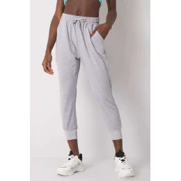 Tepláky s gumou a zavazováním v pase. Na bocích jsou nakládané kapsy, nohavice jsou zakončené švy.