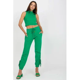 Tepláky s vysokým pasem a zavazováním v pase. Kapsy na bocích. Nohy jsou zakončené švy.