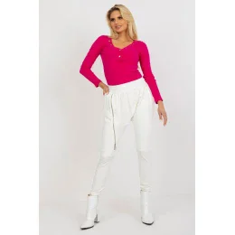 Tepláky s vysokým sedem, elastickým pasem a ozdobným zipem. Kapsy na bocích.