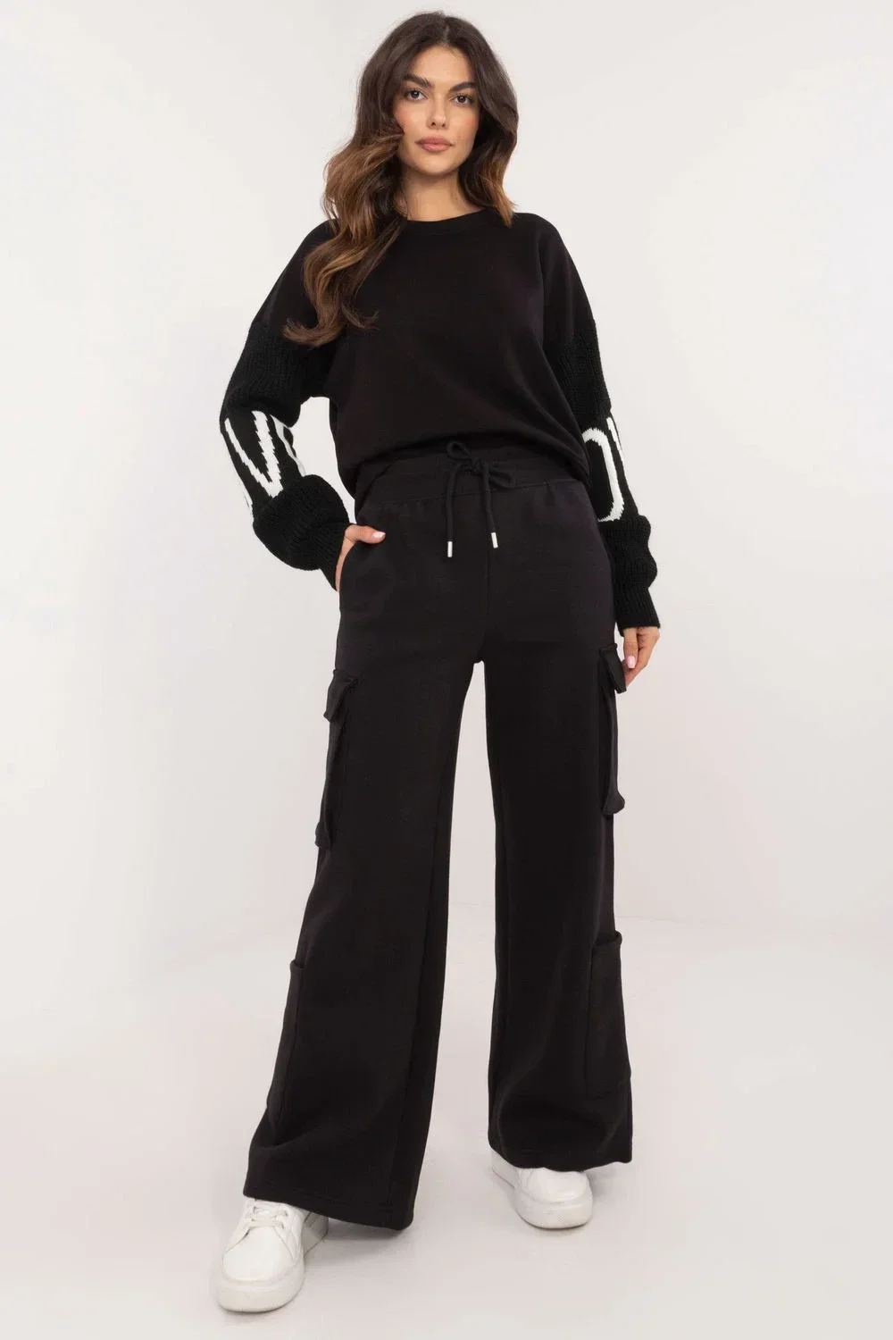 Volné teplákové cargo kalhoty, ideální na každý den, kdy potřebujete pohodlí a styl. Vyrobené z směsi bavlny a polyesteru, mají lehké zateplení, díky čemuž jsou vhodné i na chladnější dny. Mají vysoký pas a šňůrku v pase, co umožňuje ideální přizpůsobení se postavě. Široké nohavice dodávají volný charakter a praktické cargo kapsy po stranách a další kapsy na zip zajišťují funkčnost a módní vzhled. Hladký vzor z nich dělá snadno kombinovatelné s různými kousky oblečení.