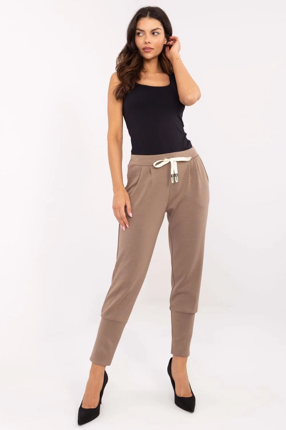 Tyto módní teplákové kalhoty jsou nabídkou pro ženy, které si cenějí pohodlí a univerzálního stylu. Vyrobeny z měkké a příjemné na dotek směsi viskózy a elastanu, kalhoty jsou pohodlné na nošení a skvěle se přizpůsobují postavě. Vysoký pas zdůrazňuje pas a opticky prodlužuje nohy, a široké manžety na spodních okrajích nohavic dodávají kalhotám sportovní charakter a brání jejich vyhrnování. To je ideální řešení pro ženy, které si cení pohodlí a funkčnosti. Šňůrkové zavazování v pase umožňuje dokonalé přizpůsobení kalhot postavě, a zasunuté boční kapsy jsou praktické a umožňují ukládání drobných předmětů, jako je telefon nebo klíče. Univerzální střih a hladký vzor činí kalhoty vhodné pro mnoho stylizací, jak pro casual, tak pro sportovní příležitosti. Můžete je nosit každodenně, na procházku, na trénink nebo na setkání s přáteli. Tyto dámské teplákové kalhoty jsou ideální volbou pro ženy, které si cení pohodlí, stylu a funkčnosti. Osvedčí se jak při každodenních aktivitách, tak při odpočinku doma.