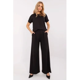 Elegantní široké džíny typu palazzo, které spojují pohodlí a eleganci v každodenním outfitu. Vyrobené z měkké směsi viskózy, polyesteru a elastanu, poskytují pohodlí a volnost pohybu. Hladký materiál a široké nohavice dodávají módní a lehce oversized charakter. Vysoký pas s elastickým pásem zajišťuje perfektní přizpůsobení postavě a ozdobné záložky na přední straně dodávají výjimečný vzhled. Model bez zapínání, vybavený praktickými bočními kapsami. Skvělé na každý den, jak do sportovního, tak elegantnějšího outfitu.