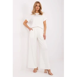 Stylové džíny typu palazzo, kombinující pohodlí a eleganci ve každodenních outfitech. Vyrobené z měkké směsi viskózy, polyesteru a elastanu, zajišťují pohodlí nošení a volnost pohybu. Hladký materiál a široké nohavice jim dodávají módní, lehce oversized charakter. Vysoký pas s elastickým pásem zajistí ideální přizpůsobení postavě, a ozdobné záložky na přední straně jim dodávají výjimečný vzhled. Model bez zapínání, vybavený praktickými bočními kapsami. Skvělé na každý den, jak do sportovních, tak do elegantnějších outfitů.