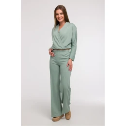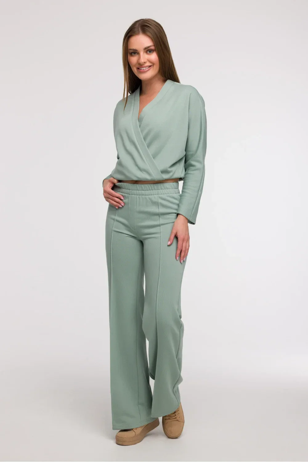 Stylové a pohodlné široké nohavice typu wide leg jsou ideální volbou pro ženy, které ocení pohodlí a módní vzhled. Vyrobené z jednobarevné látky, bez dodatečné podšívky, se hodí jak do každodenního, tak trochu elegantnějšího stylu v duchu smart casual. Široké, dlouhé nohavice s prošíváním vpředu dodávají postavě lehkost a opticky prodlužují nohy. Kalhoty mají klasický, normální střih a pohodlné zapínání na gumu v pasu, což zajišťuje volnost pohybu a snadné přizpůsobení. Chybí kapsy, což zdůrazňuje minimalistický charakter modelu. Střih byl navržen tak, aby seděl různým typům postav, zejména se bude hodit k postavě typu hruška, pomáhající vyrovnat proporce těla. Navrženo a ušito v Polsku.