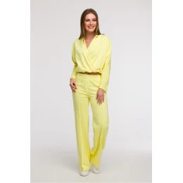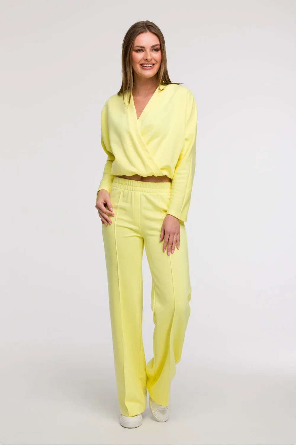 Stylové a pohodlné široké nohavice typu wide leg jsou ideální volbou pro ženy, které ocení pohodlí a módní vzhled. Vyrobené z jednobarevné látky bez dodatečné podšívky, budou skvěle vypadat jak v každodenních, tak trochu elegantnějších stylizacích v duchu smart casual. Široké a dlouhé nohavice s prošíváním vpředu dodávají postavě lehkost a opticky prodlužují nohy. Kalhoty mají klasický normální střih a pohodlné zapínání na gumu v pasu, což zaručuje volnost pohybu a snadné přizpůsobení. Chybí kapsy, co podtrhuje minimalistický charakter modelu. Střih byl navržen tak, aby seděl různým typům postav, zejména se hodí k postavě typu hruška, pomáhající vyrovnat proporce těla. Navrženo a ušito v Polsku.