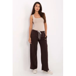 Kalhoty s casualovým charakterem, vytvořené s ohledem na každodenní pohodlí. Vyrobené z měkké a odolné směsi bavlny a polyesteru, zajistí pohodlí při nošení a odolnost proti zmačkání. Hladký materiál dělá model univerzálním a snadno se kombinuje s různými styly. Kalhoty mají vysoký pas a široké nohavice s výrazným lemem, co jim dodává moderní, lehce elegantní šmrnc. V páse jsou praktické šňůrky a vložené boční kapsy, které zdůrazňují jejich funkčnost. Dalším akcentem je jemná vyšívaná ozdoba umístěná na jedné z nohavic, dodávající celku originální charakter. Ideální na každý den, spojují sportovní volnost s nádechem elegance.
