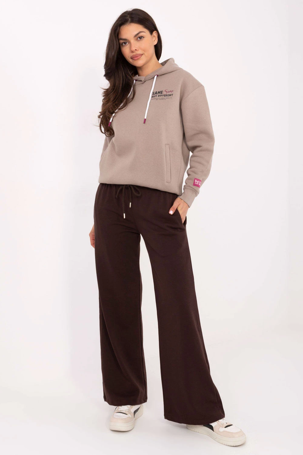 Kalhoty ve sportovním stylu, ideální na každý den. Vyrobené z vysoce kvalitní směsi bavlny a polyesteru, poskytují pohodlí a odolnost. Klasický, hladký design se skvěle hodí k různým stylizacím. Mají střední výšku a rovné nohavice, co zaručuje volnost pohybu. Stahovací pás umožňuje ideální přizpůsobení, a boční kapsy jsou praktické. Univerzální model, který se osvědčí jak doma, tak při aktivitách venku.
