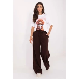 Kalhoty ve stylu casual, ideální na každý den. Vyrobena z měkké směsi viskózy, polyesteru a elastanu, poskytuje pohodlí, prodyšnost a lehkou pružnost materiálu. Hladká faktura látky jim dodává univerzální charakter, díky čemuž se snadno hodí k mnoha stylizacím. Model se vyznačuje vysokým pasem a širokými nohavicemi, které se krásně usazují v pohybu, zdůrazňujíce volný střih. V pase mají praktické šňůrky, které umožňují přizpůsobení postavě, a boční kapsy dodávají funkčnost. Moderní a pohodlné, skvělá volba pro každodenní, casualové outfity.