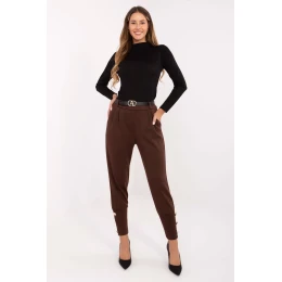 Moderní a pohodlné dámské teplákové kalhoty v casual stylu, ideální na každý den a do práce v uvolněném provedení. Vyrobené z příjemné směsi viskózy a polyesteru, zaručují pohodlí nošení a elegantní, propracovaný vzhled. Model s vysokým pasem a se zužujícími se nohavicemi skvěle zdůrazňuje postavu, zároveň poskytuje svobodu pohybu. V pasu je vsazena elastická guma, díky čemuž kalhoty skvěle sedí na postavě. Pro větší funkčnost jsou vybaveny bočními kapsami, a zapínacím páskem, který jemně zdůrazňuje pas. Na spodním lemu nohavic jsou široké manžety s ozdobnými knoflíky, které dodávají celku stylový charakter. Jedná se o skvělou volbu pro ženy, které oceňují kombinaci pohodlí a městské elegance, ideální do práce, na procházku nebo na setkání s přáteli.