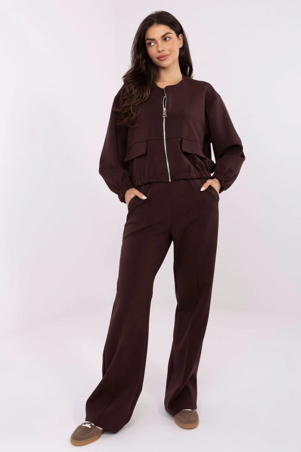 Pohodlné dámské kalhoty ve stylu casual jsou ideální volbou pro každodenní aktivity, kdy se počítá s pohodlím a módním vzhledem. Jejich hladký vzor a moderní forma je dělají skvěle padnoucí jak do sportovních stylizací, tak do volnějších outfitů na každý den. Model je vyroben z měkké a prodyšné směsi bavlny a polyesteru, díky čemuž jsou kalhoty příjemné na dotek, odolné a zajistí pohodlné nošení. Vysoký pas zdůrazňuje pas a zaručuje pohodlné přizpůsobení, zatímco široké nohavice dodávají celku módní, uvolněný charakter. V pasu je praktické šňůrkování, které umožňuje regulaci obvodu, a boční kapsy s kapsami dodávají funkčnost. Na přední straně nohavic jsou ozdobné prošívky, které jemně oživují design a dodávají kalhotám stylové dokončení. Jedná se o ideální model pro ženy, které ocení pohodlí, moderní vzhled a funkční detaily.