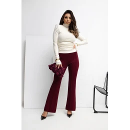 Měkké tepláky vyrobené z materiálu typu "máslo", mimořádně jemného, elastického a příjemného na dotek. Model je charakterizován vysokým pasem a širokými zvonovými nohavicemi, které dodávají outfitu uvolněný, lehce retro charakter. V pase je vsazena elastická guma pro ideální přizpůsobení a pohodlné nošení po celý den. Na přední straně jsou umístěné ozdobné prošívky běžící po celé délce nohavice, které opticky prodlužují postavu a dodávají celku elegantní dokončení. Tepláky se skvěle hodí do každodenních, volných outfitů jak do práce, tak do běžného života. Hladký materiál z viskózy a elastanu zajišťuje pohodlí, prodyšnost a krásné padání na postavě. Model bez zapínání a bez kapes, navržený s ohledem na maximální pohodlí a minimalistický styl.