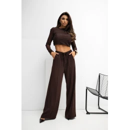 Měkké široké nohavice typu palazzo vyrobené z velmi jemného, elastického a příjemného materiálu. Díky vysokému pasu a širokým nohavicím se model krásně přizpůsobí postavě a zároveň zajistí pohodlné nošení. Na přední straně jsou jemné dekorační švy, které dodávají nohavicím elegantní charakter a opticky prodlužují nohy. V pase je pohodlné šněrování pro ideální přizpůsobení postavě, a boční kapsy dodávají modelu ležérní styl a funkčnost. Hladký materiál s příměsí elastanu a viskózy zajišťuje, že nohavice jsou prodyšné, elastické a skvěle se hodí do každodenních outfitů, jak do práce, tak na volný čas. Ideální volba pro ty, kteří ocení pohodlí spojené s moderním minimalistickým stylem.