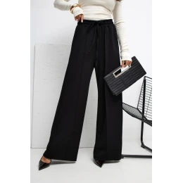 Měkké dresové kalhoty typu palazzo vyrobené z velmi jemného, elastického a příjemného materiálu. Díky vysokému pasu a širokým nohavicím model krásně padne na postavě, zajišťuje zároveň maximální pohodlí při nošení. Na přední straně jsou jemné dekorativní stehy, které kalhotám dodávají elegantní charakter a opticky prodlužují nohy. V pasu je pohodlné šněrování, umožňující ideální přizpůsobení postavě, a boční kapsy dodávají modelu ležérní styl a funkčnost. Hladký materiál s příměsí elastanu a převahou viskózy dělá kalhoty prodyšné, elastické a skvěle se hodí do každodenních outfitů, jak do práce, tak i na volný čas. Ideální volba pro ty, kteří ocení pohodlí spojené s moderním, minimalistickým stylem.