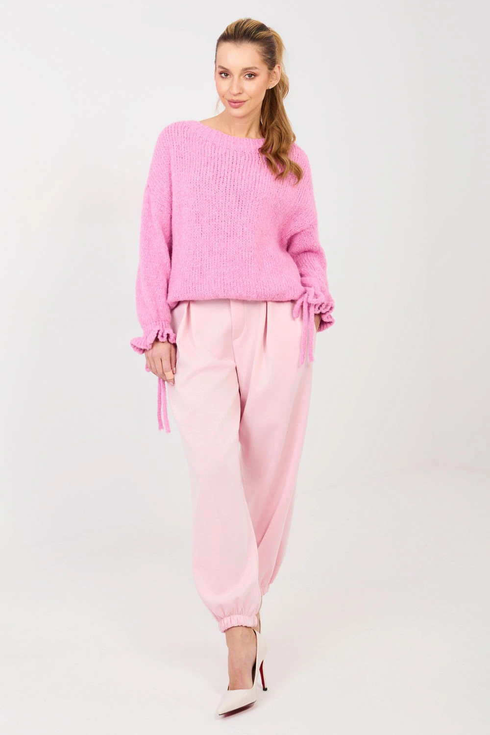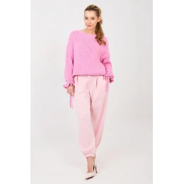 Volnější kalhoty typu joggery jsou kombinací pohodlí a stylového vzhledu, ideální na každý den a do pracovního prostředí v uvolněném stylu. Vyrobené z měkké a elastické směsi viskózy s přídavkem elastanu poskytují pohodlí nošení a volnost pohybu. Model s hladkým vzorem a ozdobnými záložkami vpředu, které kalhotám dodávají elegantní charakter. V zadní části je vsazena elastická guma, která zajišťuje dobrou přizpůsobivost postavě. Nohavice jsou zakončeny lemováním, které zdůrazňuje střih joggery a zajišťuje pohodlí při nošení. Kalhoty nemají zapínání a boční kapsy zvyšují jejich funkčnost. Celkový vzhled doplňuje ozdobné knoflíček, který představuje stylový detail. Ideální pro každodenní stylizace s mikinou, svetrem nebo košilí.