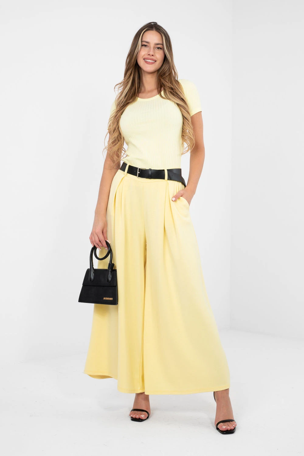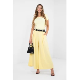 Elegantní široké teplákové kalhoty typu palazzo jsou spojením pohodlí a elegance v moderním provedení. Vyrobené z vysoce kvalitní směsi viskózy, polyesteru a elastanu, okouzlují tkaninou typu "máslo" neuvěřitelně měkkou, jemnou a mimořádně příjemnou na dotek. Materiál krásně padne na postavu, poskytující pohodlí po celý den. Model s vysokým pasem má v pase vsazený gumový pásek, který zaručuje ideální přizpůsobení bez pocitu stísnění. K tomu je přidán pás s přezkou, který zdůrazňuje pas a dodává celku elegantní charakter. Absence klasického zapínání zvyšuje pohodlí použití. Široké nohavice ve stylu palazzo dodávají postavě lehkost a volnost, a ozdobné kontrafałdy vpředu dodávají kalhotám rafinovaný akcent. Hladký vzor dělá z modelu univerzální kousek snadno kombinovatelný, skvěle se hodí jak do každodenního nošení, tak do práce. Boční, vložené kapsy zvyšují funkčnost, spojují praktičnost s elegantním stylem.