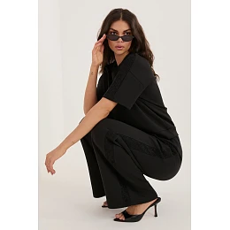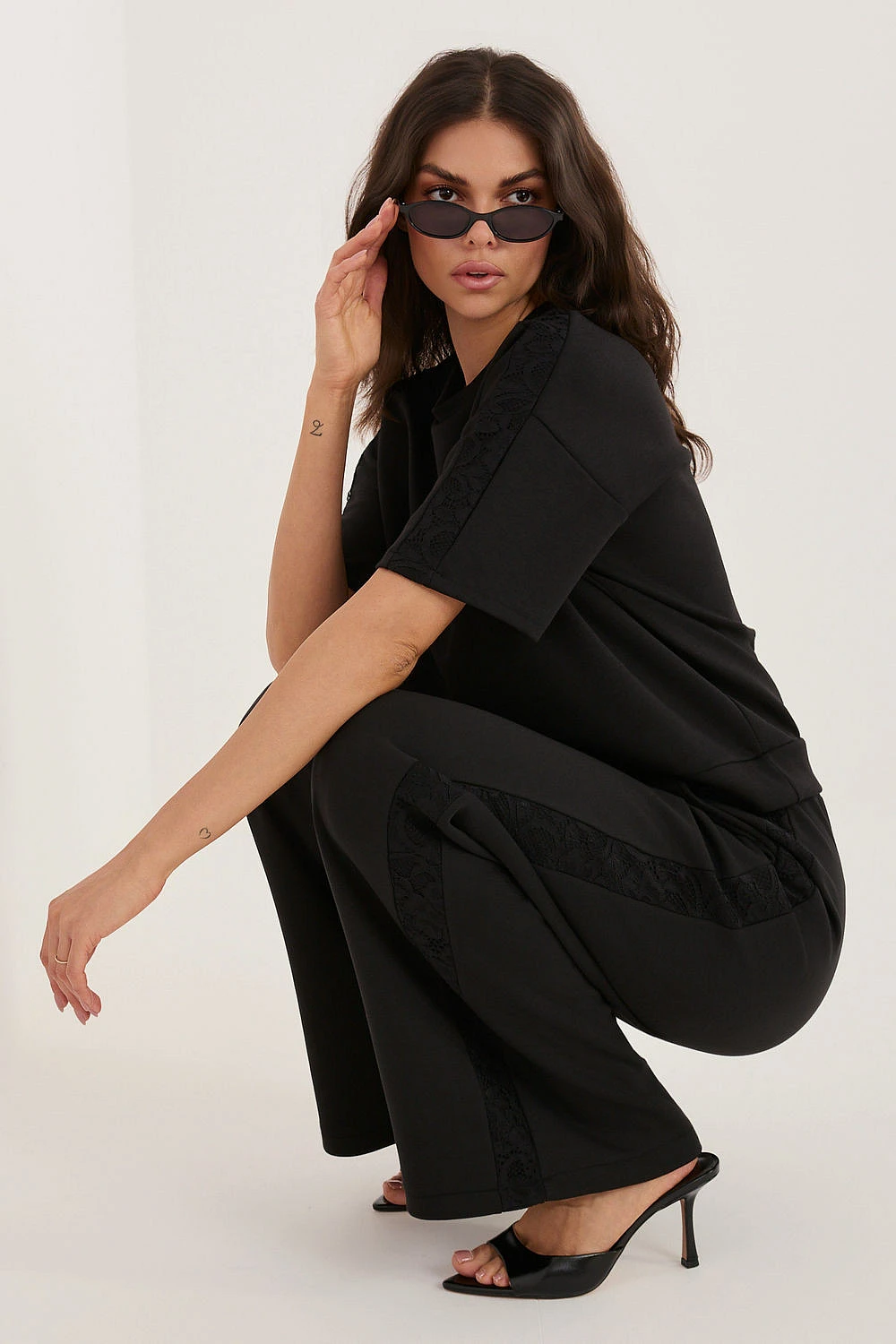 Kalhoty ve stylu wide leg jsou skvělou kombinací pohodlí a moderního stylu. Navrženy s ohledem na každodenní použití, skvěle se hodí jak do každodenního nošení, tak i do více ležérního outfitu do práce. Model s dlouhými, širokými nohavicemi poskytuje volnost pohybu a trendy, uvolněný vzhled. Vysoký pas zdůrazňuje pas a šňůrka v pase umožňuje perfektní přizpůsobení postavě. Hladký vzor dělá kalhoty univerzální a snadné na stylování. Vyrobené z příjemné směsi polyesteru, viskózy a elastanu, zaručují pohodlí nošení a trvanlivost. Další výhodou jsou decentní pruhy z krajky, které dodávají celku ženský a elegantní charakter. Praktické, boční kapsy zvyšují funkčnost modelu, dělají je ideální volbou na různé příležitosti, od procházek po městě po den v kanceláři v méně formálním stylu.