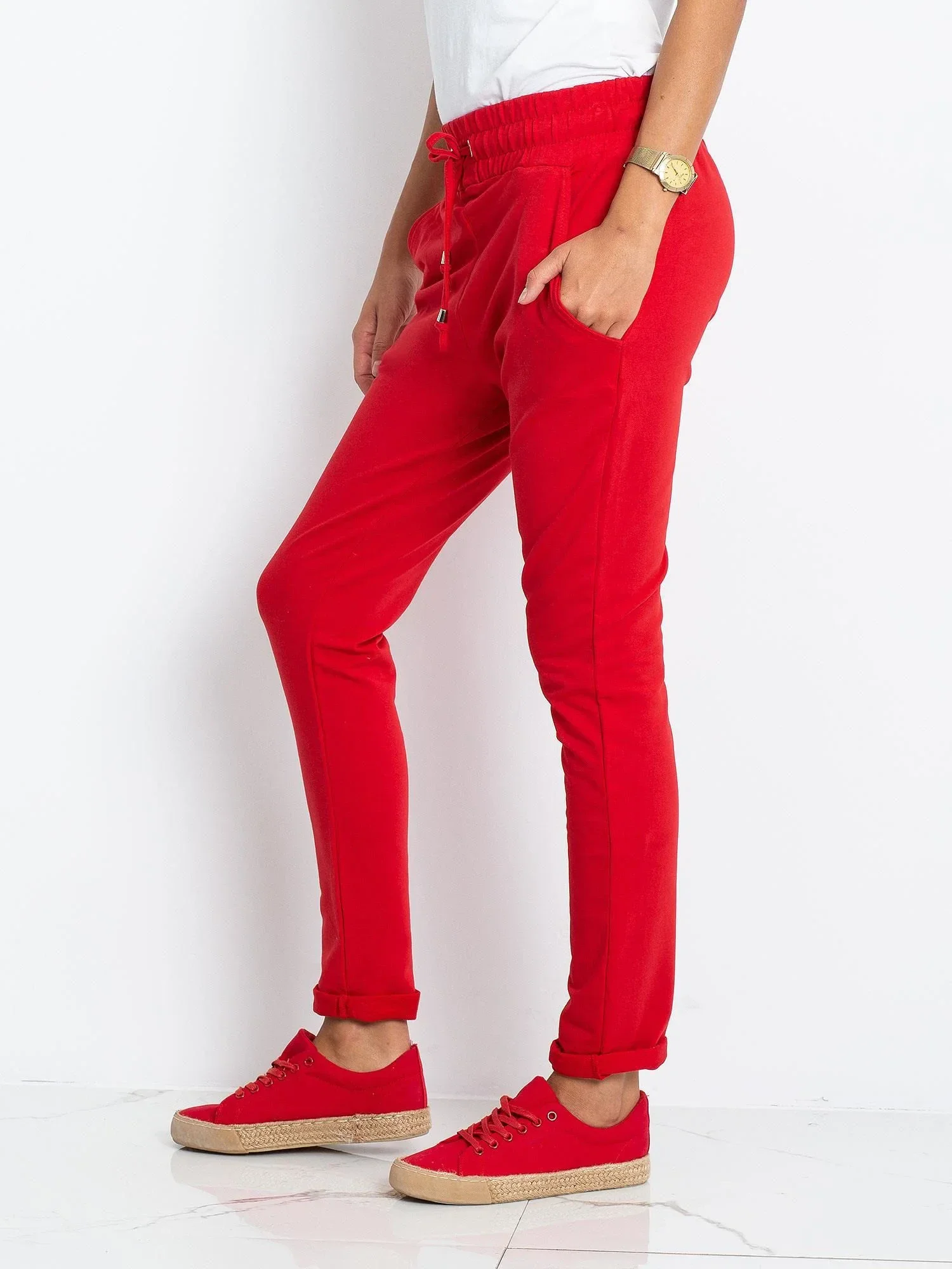 Dámské tepláky z bavlny v červené barvě.