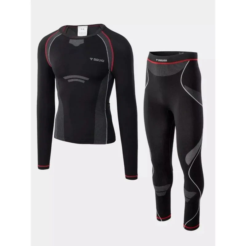 Souprava pánského termoprádla BRUGI. Souprava trička s dlouhým rukávem a dlouhých legín. Oblečení je vyrobeno z vysoce kvalitních elastických termoaktivních materiálů, které se dokonale přizpůsobí tělu a odvádějí vlhkost ven. Rychleschnoucí materiál je ideální pro fyzické aktivity i každodenní použití. Oblečení tohoto typu může být první termovrstvou (tzv. základní vrstvou) pro aktivní uživatele. Souprava spodního prádla ideální pro běh, cyklistiku, na hory nebo lyžování či snowboarding. Spodní prádlo je ideální pro letní i zimní období.