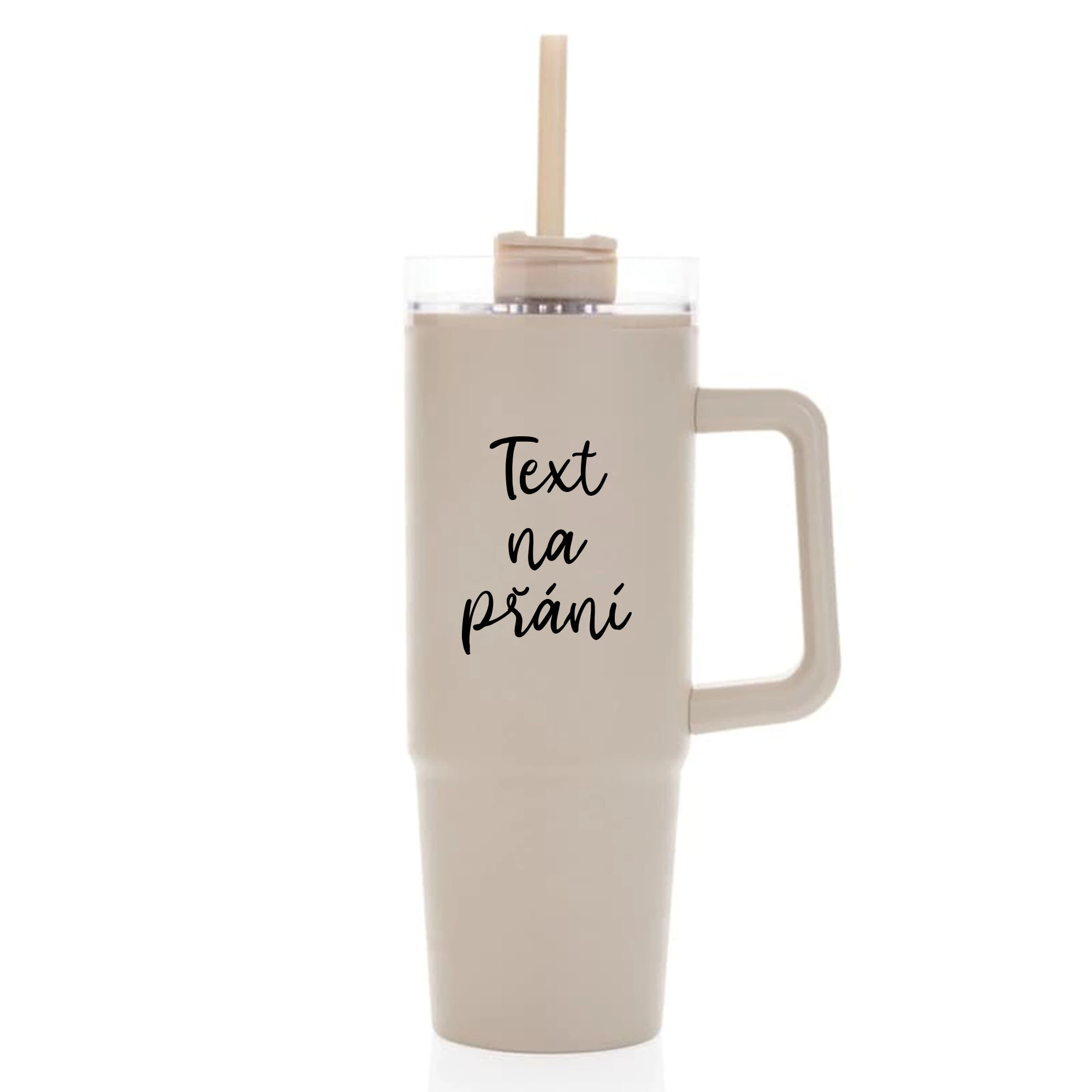 TEXT NA PŘÁNÍ - béžový cestovní termohrnek s průhledným víčkem 900 ml