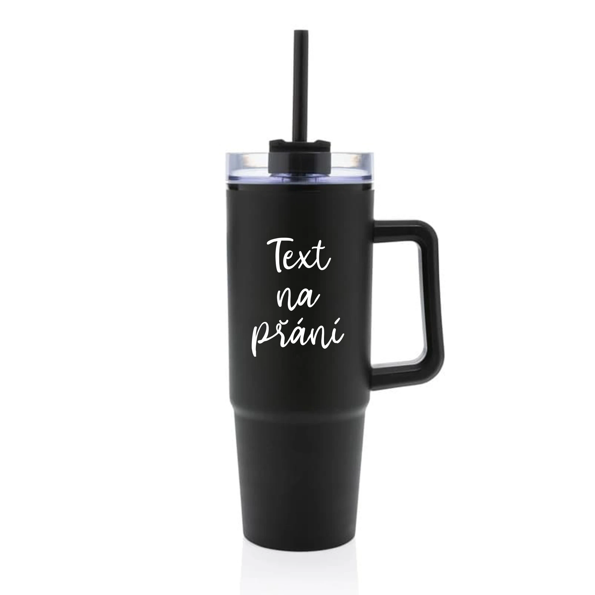 TEXT NA PŘÁNÍ - černý cestovní termohrnek s průhledným víčkem 900 ml