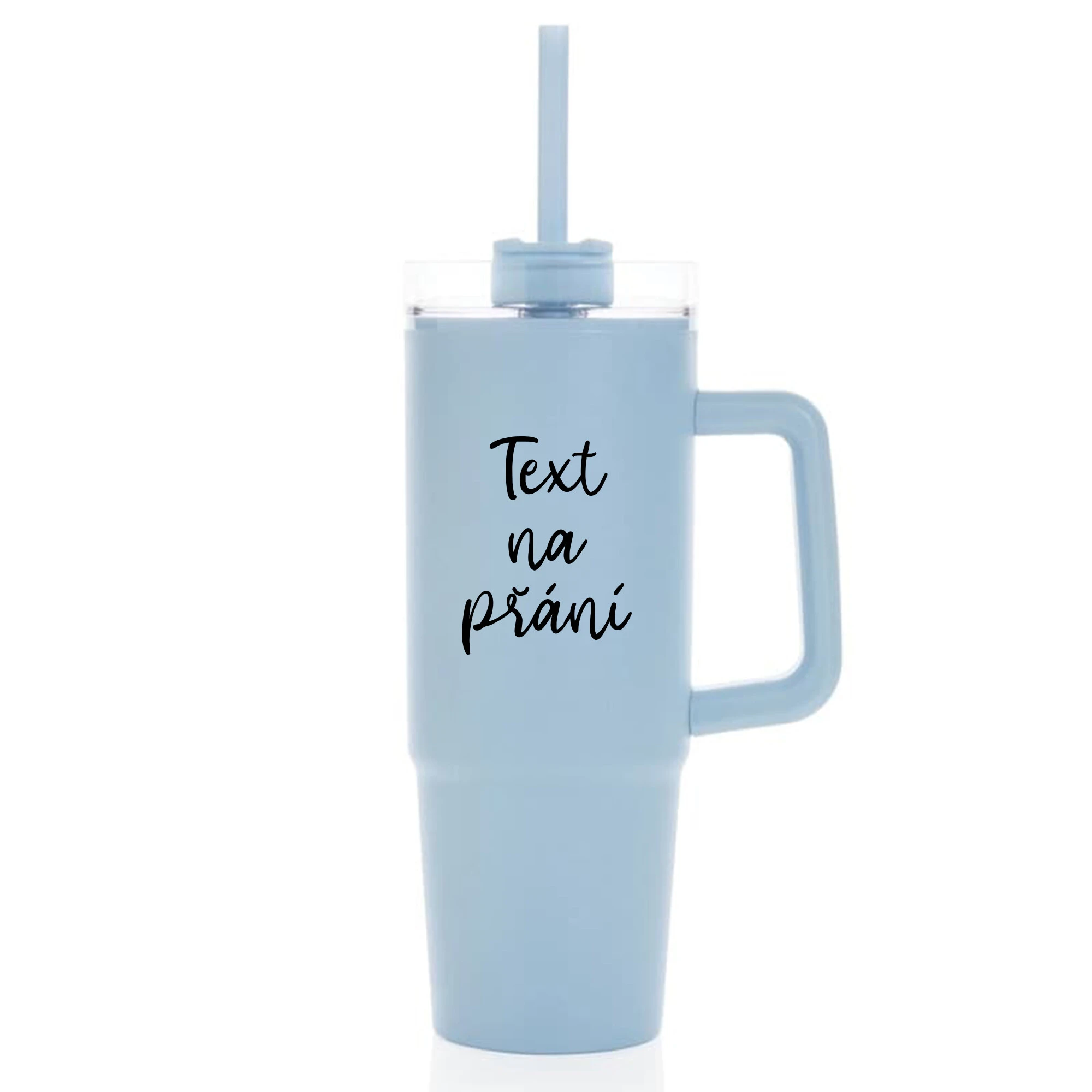 TEXT NA PŘÁNÍ - světle modrý cestovní termohrnek s průhledným víčkem 900 ml