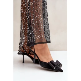 Elegantní dámské lodičky vyrobené z textilního materiálu. Přední část bot je zdobena efektní mašlí, která přitahuje pozornost a dodává jim výjimečný charakter. Špičaté špičky opticky prodlužují nohy a podpatek ve formě jehlového podpatku podtrhuje siluetu. Ideální volba na večerní vycházky. Tyto lodičky jsou kombinací stylu, pohodlí a nadčasové elegance! Při výběru velikosti se řiďte tabulkou velikostí.