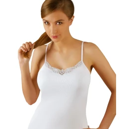 Dámské tílko s úzkými ramínky je vyrobené z příjemné bavlny. Dekolt je zdobený všitou krajkou.