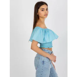 Světle modrá krátká pruhovaná halenka s volánkem .