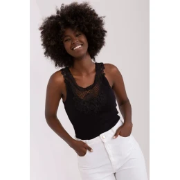 Tričko bez ramínek z žebrované tkaniny s kulatým výstřihem. Výstřih zdobí všitá krajka.