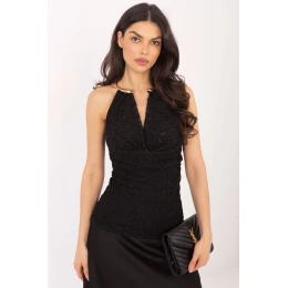 Elegantní krajkový top s odkrytými zády je výjimečnou nabídkou pro ženy, které rády zdůrazňují svůj styl jemně smyslným způsobem. Vyrobený z vysoce kvalitní viskózy s přídavkem elastanu, zaujme příjemným omakem, jemně elastickým materiálem a různorodou fakturou, která mu dodává vznešený charakter. Model má standardní délku a bez rukávů, díky čemuž vypadá lehce a moderně. Vepředu upoutá pozornost tekoucí výstřih, elegantně padající na siluetu. Zadní část zaujme efektním výstřihem, záda zůstávají odkrytá a celý top je připevněn kolem krku pomocí kovového kroužku, který představuje originální a stylovou ozdobu. Top je vybaven podšívkou, zajistí pohodlí a správné uspořádání materiálu během nošení. Je to ideální volba na speciální příležitosti, večerní vycházky nebo elegantní outfit, ve kterém hraje roli spojení elegance, ženskosti a moderního výrazu.