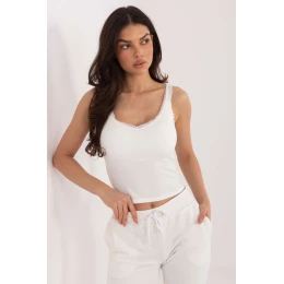 Volně střižené tričko s vestavěným podprsenkem je pohodlný a stylový návrh na každý den. Vyrobena z měkké, pruhované pleteniny z viskózy s přídavkem elastanu, skvěle se přizpůsobuje postavě, poskytuje pohodlí nošení a správnou podporu bez nutnosti použití dalšího prádla. Model s krátkou délkou, na ramínkách, s módním výstřihem do srdce jemně zdůrazňuje linii krku a ramen. Hladký vzor dává tričku univerzální charakter, a jemná krajková ozdoba u výstřihu a ramínek dodává celku ženskou eleganci a lehkost. Ideální pro každodenní outfit, buď samostatně, nebo pod sako nebo svetr.