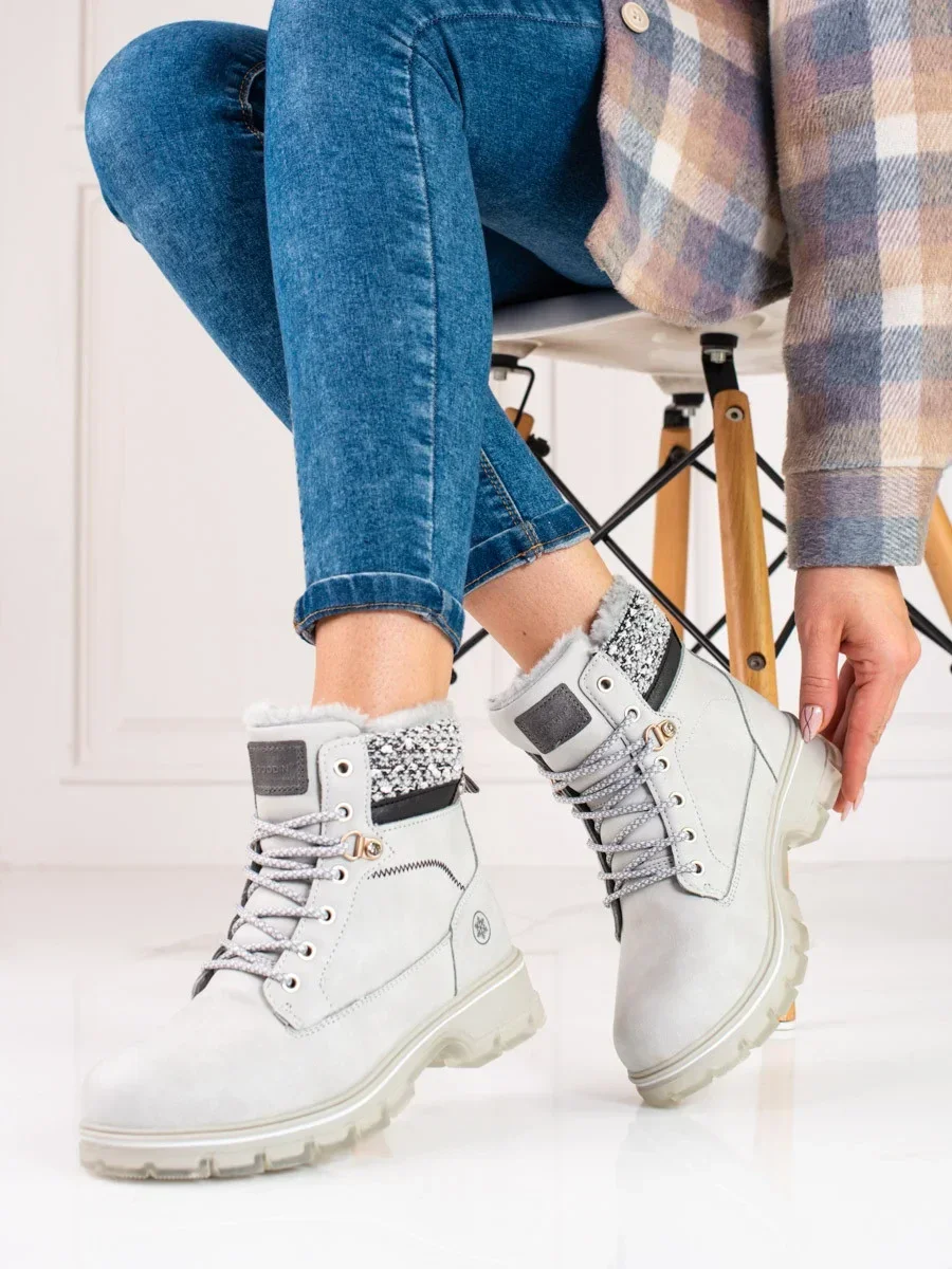 Trendy kotníčkové boty dámské šedo-stříbrné na plochém podpatku