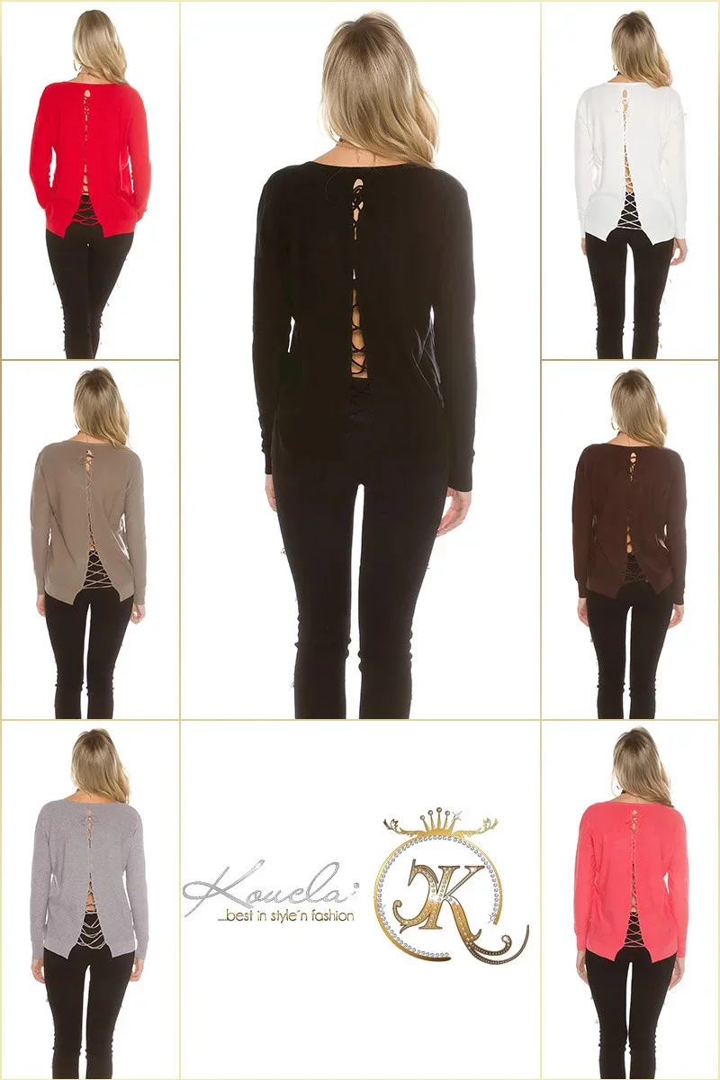 Sexy dámský svetr s kulatým výstřihem, dlouhé rukávy. Vzadu stahování na šňůrku.