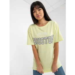 Světle žluté volné tričko s potiskem .