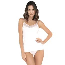 Elegantní hladká halenka s krásnou krajkovou ozdobou podél výstřihu. Model typu basic, na tenkých, nastavitelných ramínkách, bude perfektní v mnoha různých stylizacích.