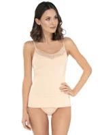 Elegantní hladká halenka s krásnou krajkovou ozdobou podél výstřihu. Základní model s tenkými, nastavitelnými pásky. Ideální pro různé stylizace.