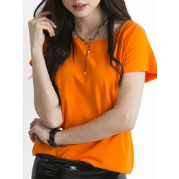 Pomarańczowy t-shirt Circle Gładka bawełniana koszulka to świetna sprawa, więc powinna znajdować się w każdej damskiej garderobie. Z jej pomocą stworzysz wiele rozmaitych stylizacji na różne okazje, od zwykłego wyjścia do pracy, po zestaw imprezowy. Taki rodzaj ubrania jest bardzo twarzowy, uniwersalny i ponadczasowy, ponieważ każdy dobrze w nim wygląda i łatwo dopasować do niego pozostałe elementy garderoby. Nasz gładki t-shirt damski ma okrągły dekolt, krótkie rękawy oraz swobodniejszy fason, dzięki czemu jest bardzo wygodny w noszeniu i super układa się na sylwetce. Dodatkowo jest wykonany z wysokiej jakości materiału, który jest nie tylko przewiewny, ale także bardzo przyjemny w dotyku. Damski t-shirt z bawełny idealnie sprawdzi się więc w Twojej codziennej garderobie. Łącz go ze spodniami jeansowymi, szortami oraz spódnicami.